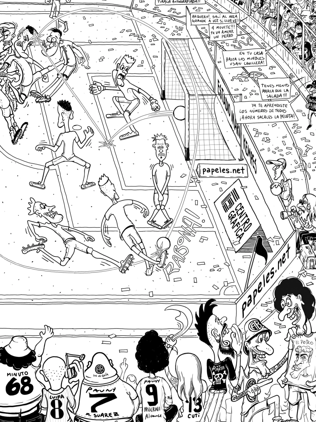 ¡La posta es que es más que una lámina! El "Turco" relata la jugada que termina en un golazo... ¿pero quién lo hace? ¿El Pirata o el Matador? ¡Vos completás el relato final del "Turco"! Después, a pintar las camisetas de tu equipo y de los que "pierden" (¡bah, los que vos decidas que pierden!). También podés: